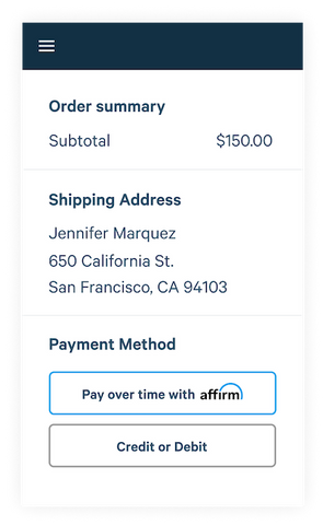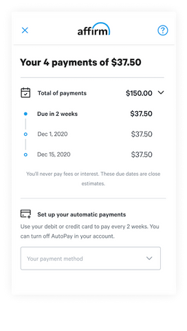 When you buy with Affirm, you always know exactly what you'll owe and when you'll be done paying. You’ll never pay a hidden fee—or any fee, for that matter.